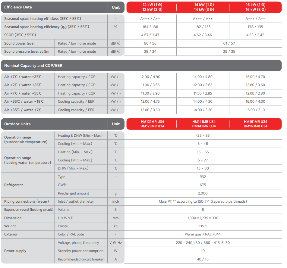Го користи новиот еколошки фреон R32. Облога со црна перка на разменувачот на топлина. Одлични перформанси при ниска надворешна температура (100% на -7°C). LG Wi-Fi решение (Smart thinQ) Температура на излезната вода до 65°C